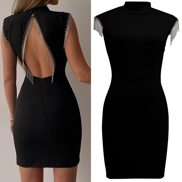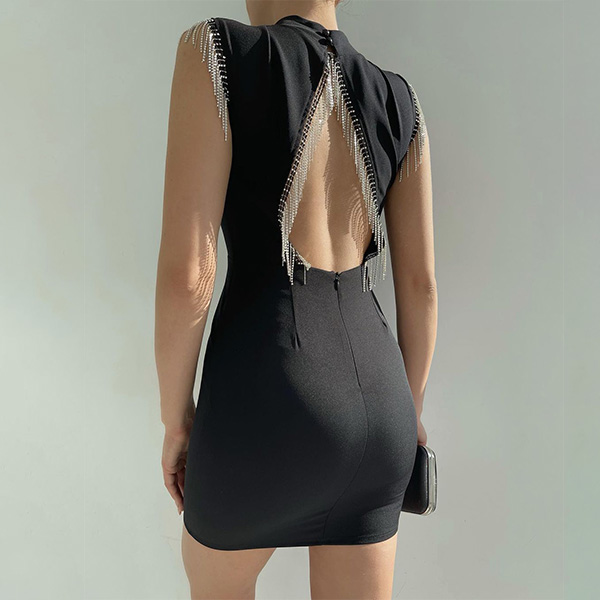 Need a sexy and stylish dress to help you stand out of crowd? How about this one? The stand collar and backless design are both sexy and stylish, while the tassel detailing adds a touch of fun and playfulness. The bodycon silhouette ensures that you'll look your best, wanna have one?
