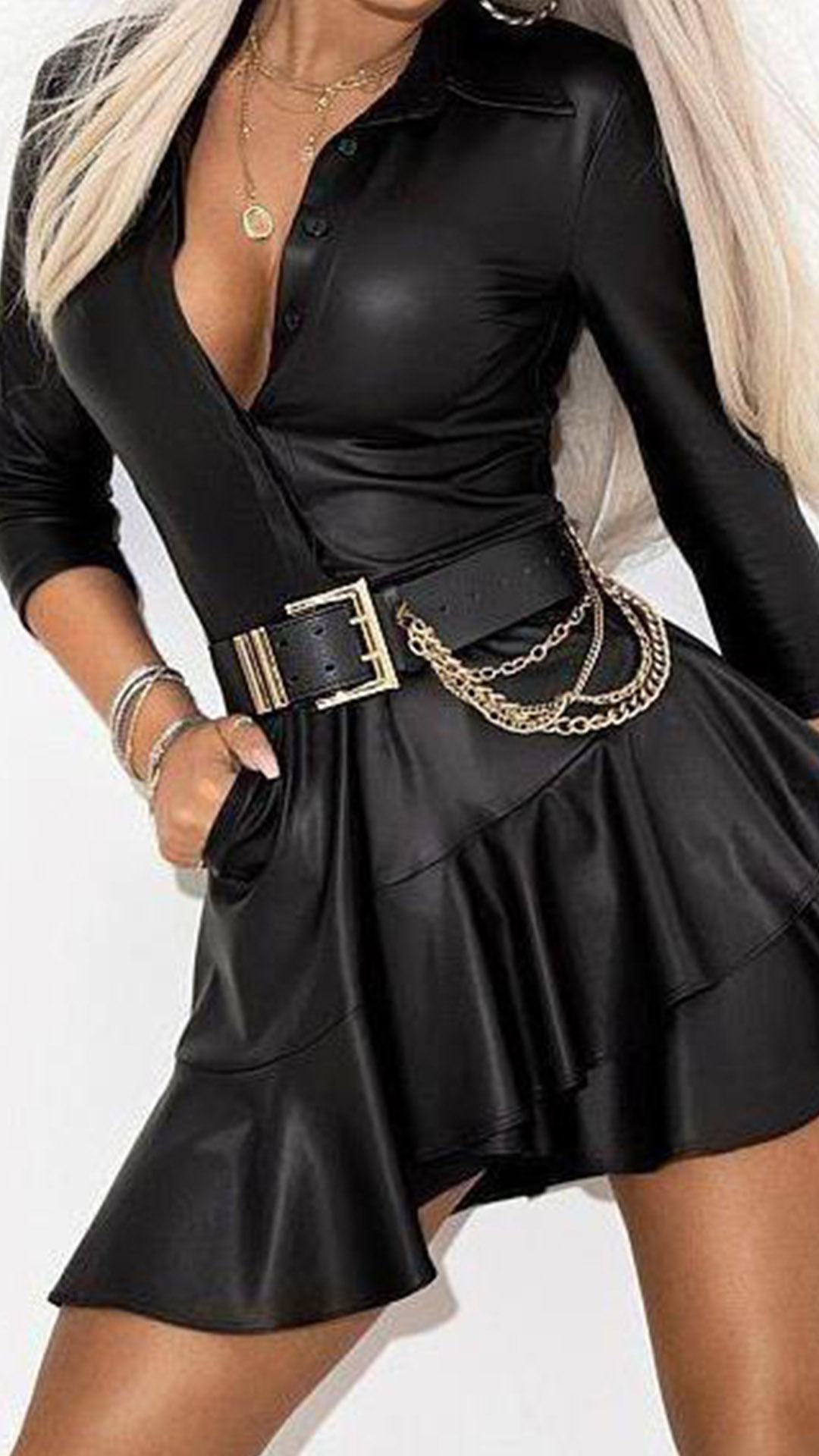 Crafted with high-quality artificial leather PU material, this dress offers both style and attitude. The stand collar adds a unique and chic element to the dress. The V-neckline accentuates the décolletage and adds a hint of sensuality to the dress. The ruffled details add a playful and feminine touch to the dress. They create movement and dimension, adding an extra level of style and flair.