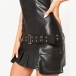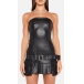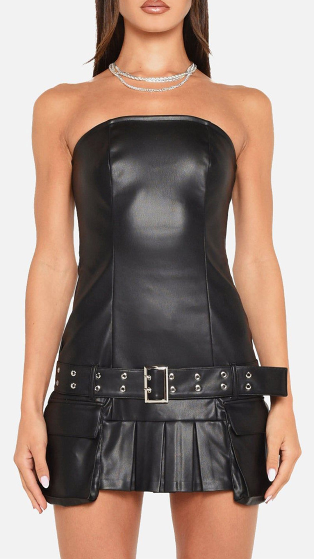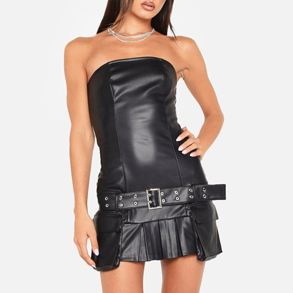 This daring and eye-catching mini dress is a stunning fusion of edgy style and feminine allure. The key features include a strapless, bodycon silhouette, a flirtatious ruffle detail, a belt, and a luxurious artificial leather (PU) fabric. It is a bold and confident choice for special occasions!