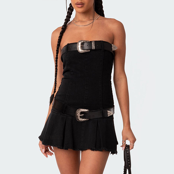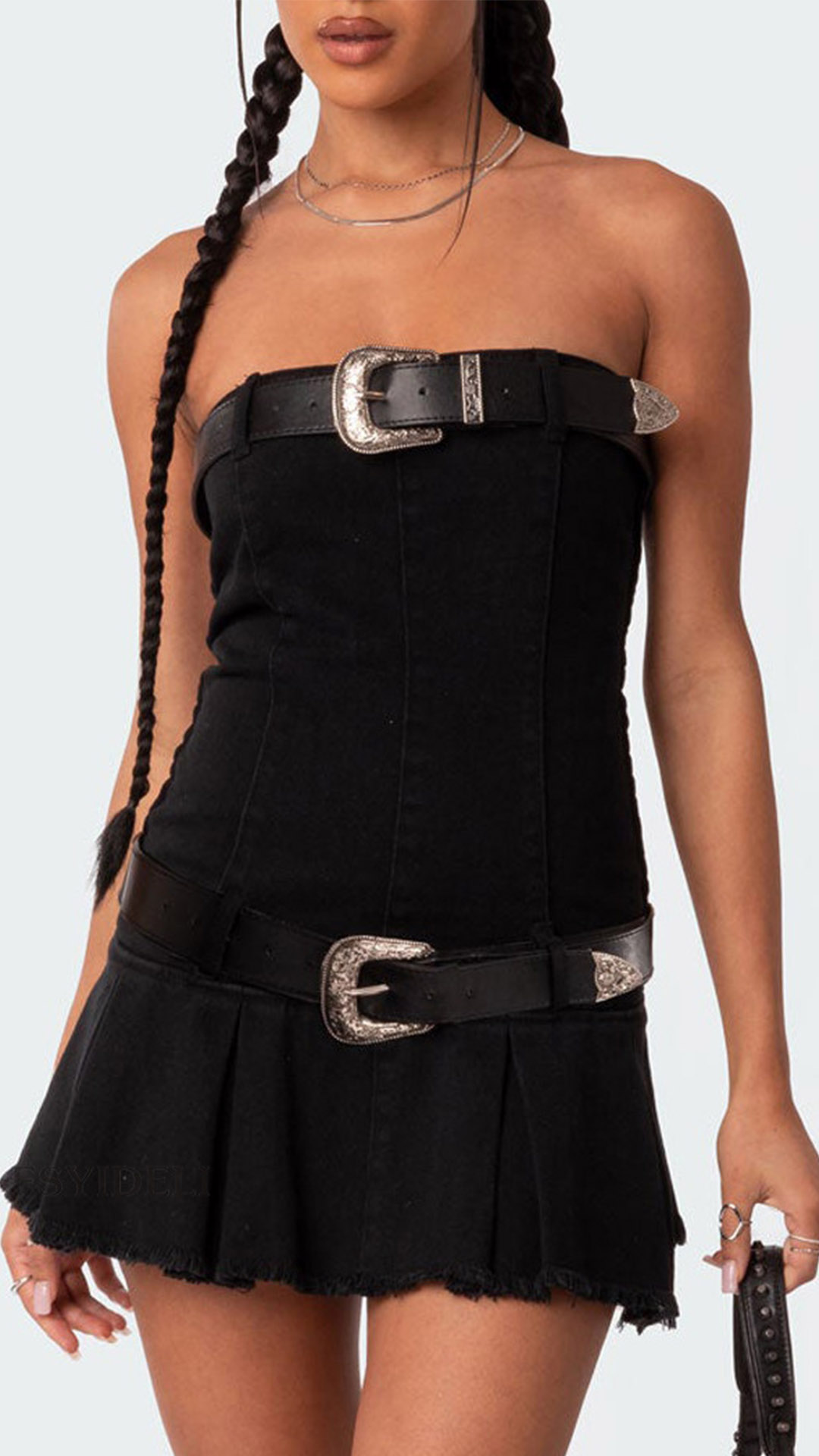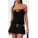 This head-turning mini dress is a captivating blend of allure and sophistication. The key features of this ensemble include a strapless, bodycon silhouette, a flirtatious ruffle detail, and a belt, creating a sultry and figure-flattering look.