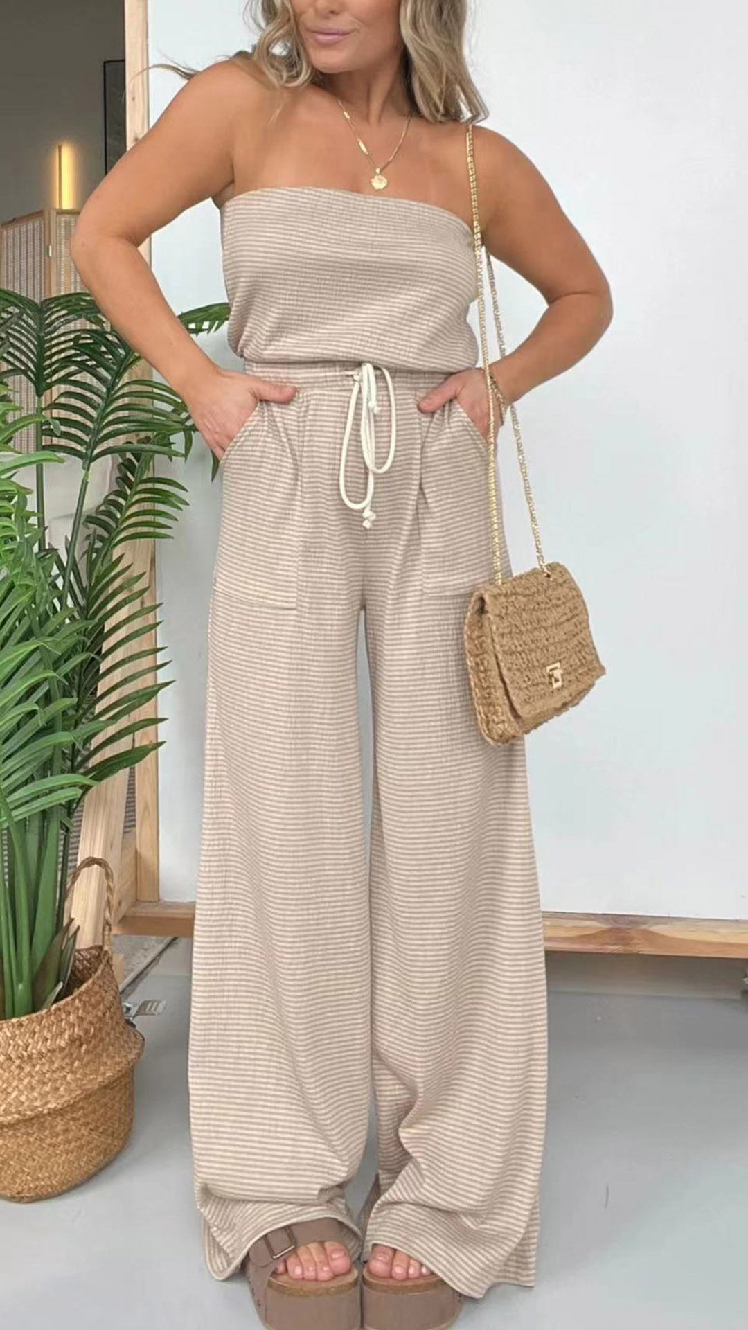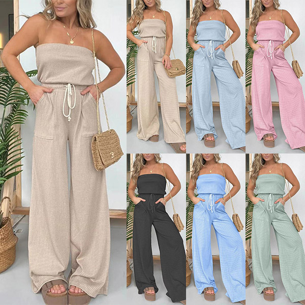 This jumpsuit features a strapless neckline, a drawstring waist, and wide-leg pants, creating a sexy and stylish ensemble that is perfect for special occasions, parties, or your fashion vacation wear!