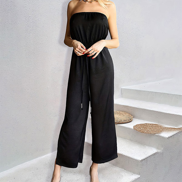 This sexy jumpsuit features a strapless design, an elastic waist, and wide-leg pants, creating a chic and alluring look. Pair it with heels and statement accessories for a glamorous ensemble that will have you looking and feeling fabulous.
