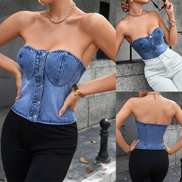 Sexy Strapless Front Button Sweetheart Neckline Denim Vest