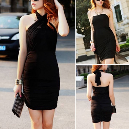 Sexy Strapless Halter Solid Color Slim Fit Dress