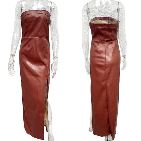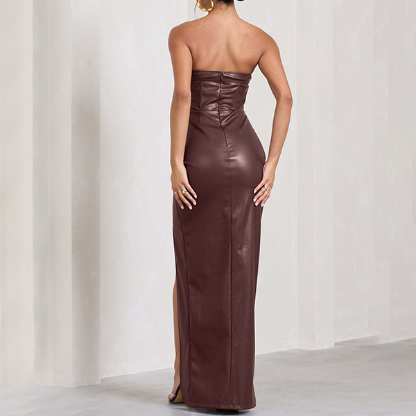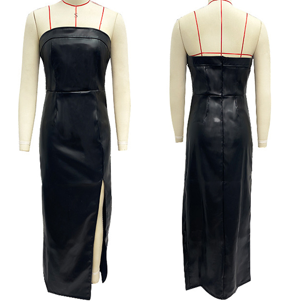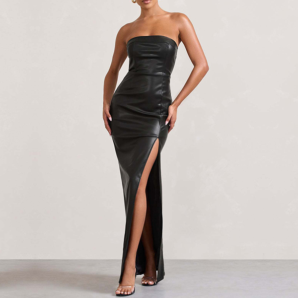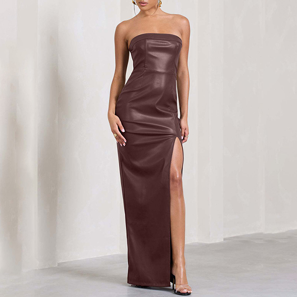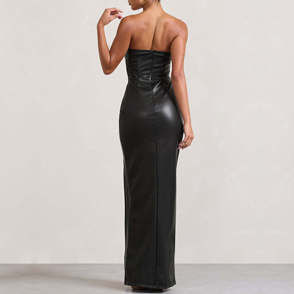 Sexy Strapless High-slit Artificial Leather PU Maxi Dress