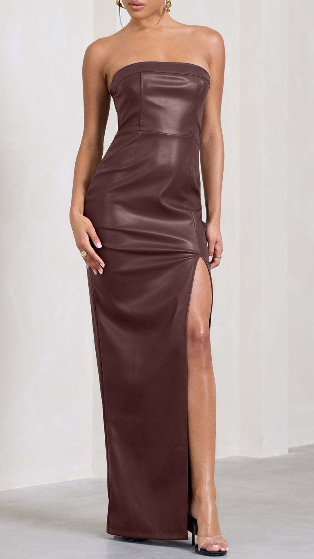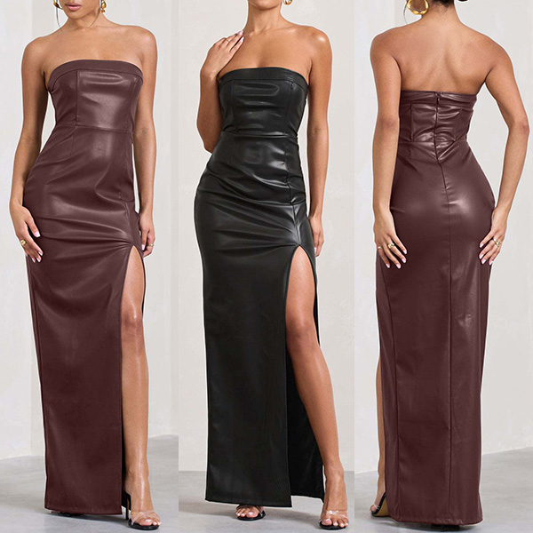 This alluring and glamorous dress features a strapless neckline, a high side slit, and a lustrous artificial leather PU fabric, creating a head-turning and seductive effect!