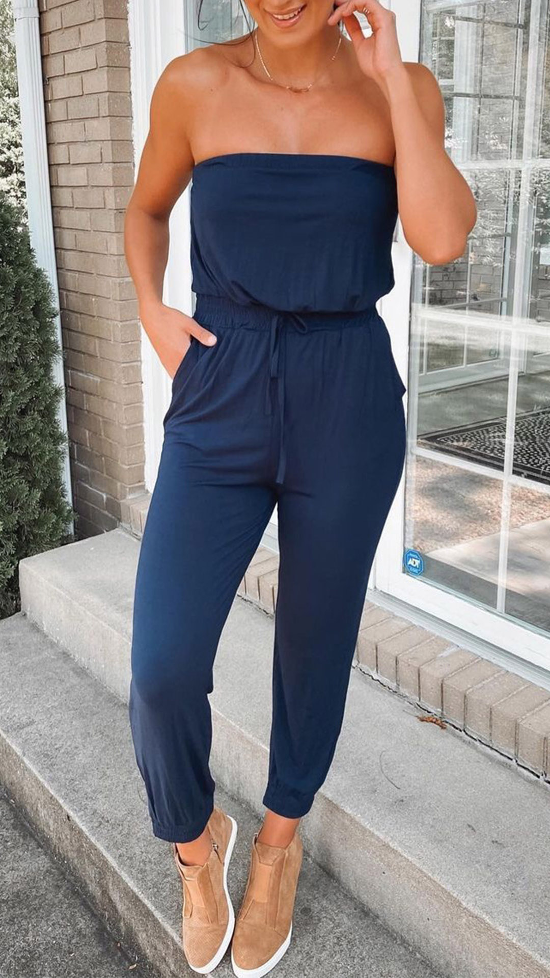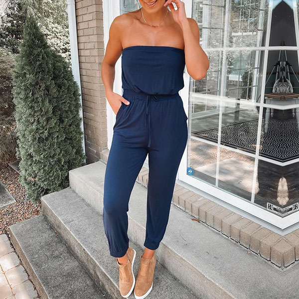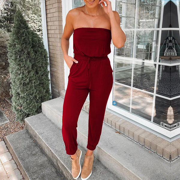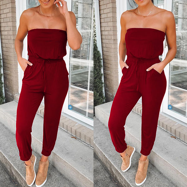 Exhibit your incredible style sense with this sexy,flirty jumpsuit. Strapless style design gives you the chance to flaunt off your charming shoulder and seductive collarbone. Solid color style,with high waist and a clean silhouette,this piece can help you gain more eyes. Try to match with a choker necklace to express your beauty and charm.