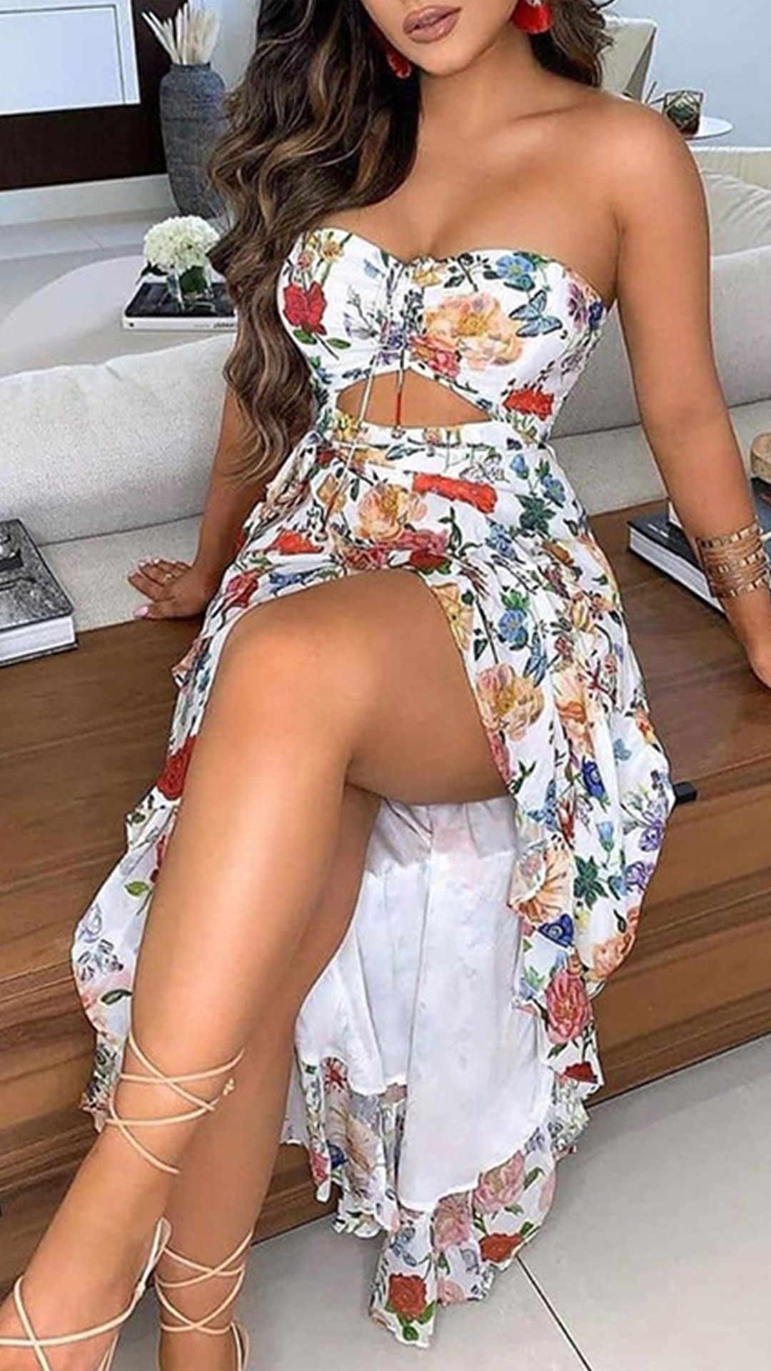 Where bohemian and flirty vibes collide - this dress is just the thing you need on these hot summer days. Strapless,hollow out high waist and slit hem design make this piece look so alluring,while the colorful printed details will make you look more eye-catching. No matter when and where you are,you can easily be the focus when you don this little stunner.
