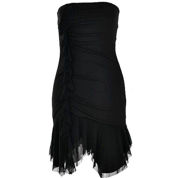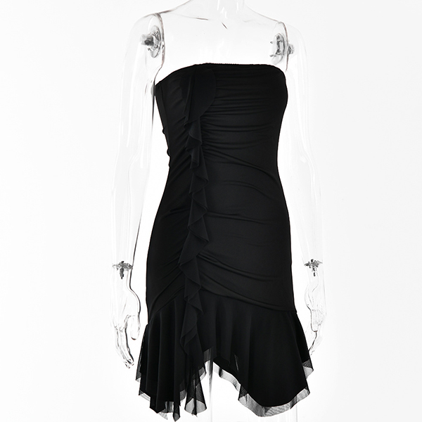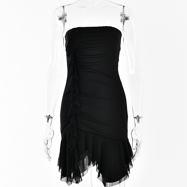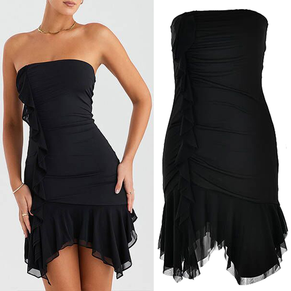 Crafted with attention to detail, this dress features a strapless neckline that accentuates your shoulders and collarbone, adding a touch of sensuality. The bodycon fit hugs your curves in all the right places, creating a flattering and confident look. And its ruffle irregular hemline adds a dramatic and eye-catching element to the overall design. Wanna have one?
