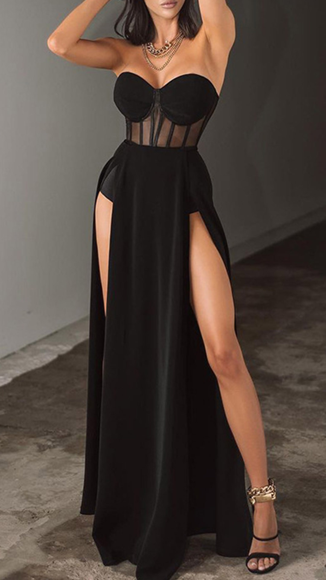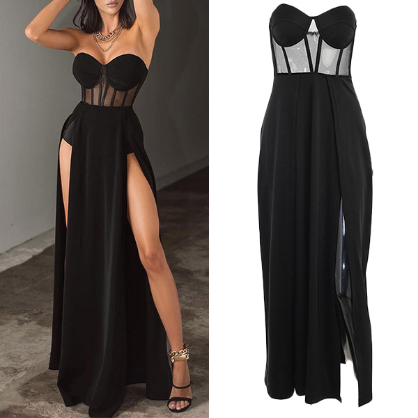 When stepping into a party,you can trust in this dress to make you stand out in the crowd. Strapless style and high slit hem design make it look so alluring,and the sheer gauze details will further enhance its charm. Paired with your sexy heels and sparkle necklace,you can look amazing and charming enough!