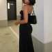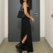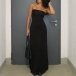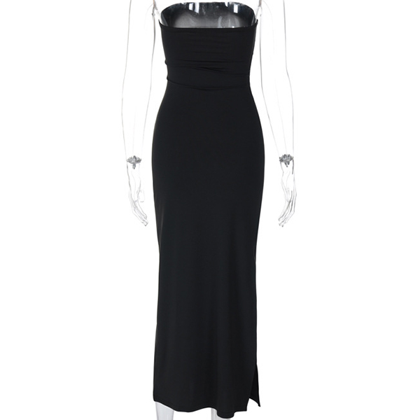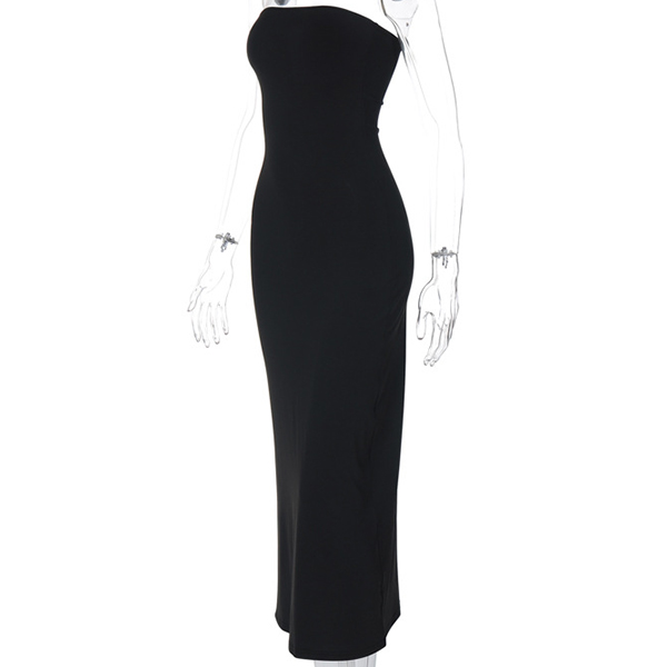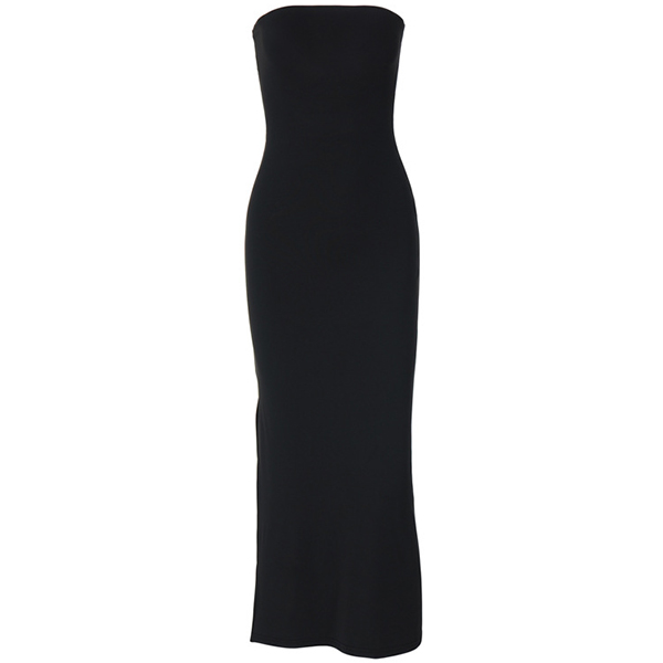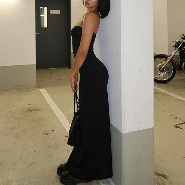 This sultry black dress features a strapless neckline that highlights your shoulders and collarbone, exuding effortless elegance. Pair it with high heels and minimal accessories for a sleek, sophisticated look.