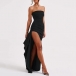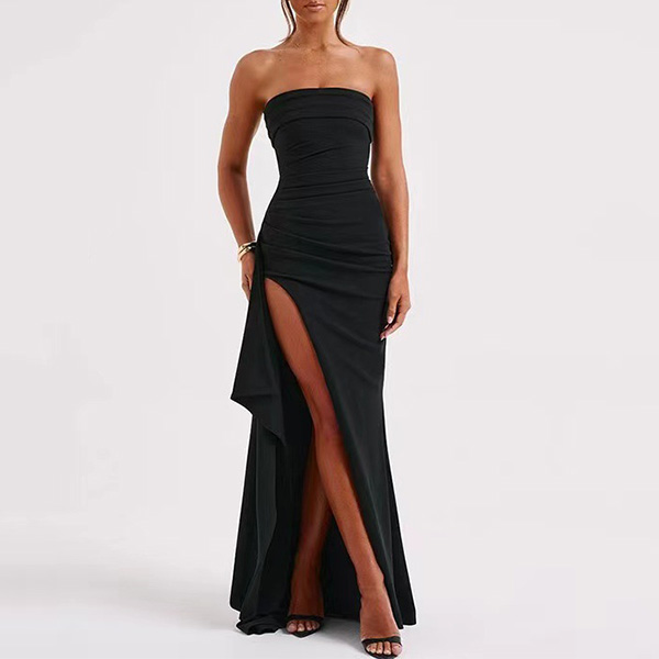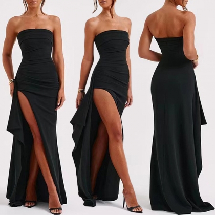 Look at this maxi party dress!The strapless neckline showcases your shoulders and collarbone, adding a touch of elegance. The side slit with ruflle details adds a flirty and alluring touch, allowing you to show off just the right amount of leg. Made from high-quality and comfortable fabric, this maxi dress ensures a flattering fit and allows for easy movement. Perfect for those special occasions or a glamorous night out, this dress is designed to make a statement.