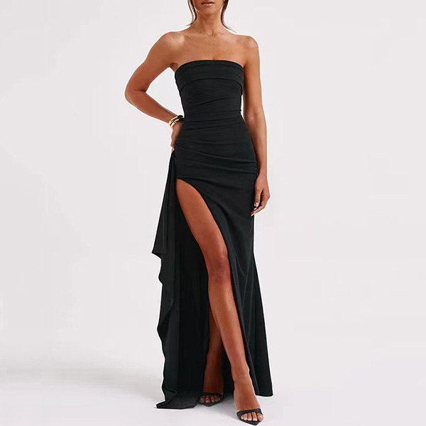 Sexy Strapless Side Slit Ruffle Maxi Dress