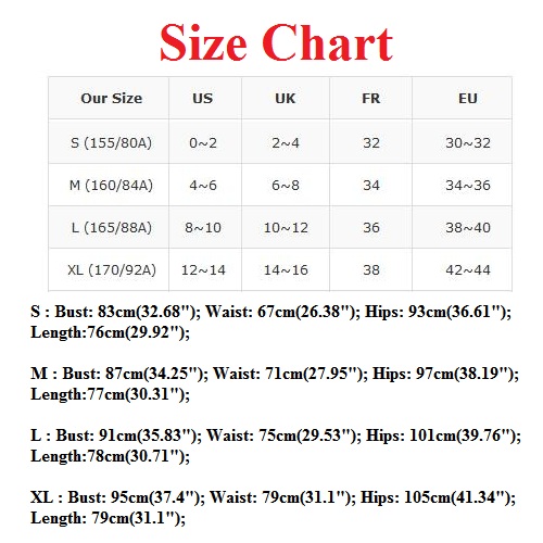 XL : Bust : 95cm(37.4"); Waist : 79cm(31.1"); Hips : 105cm(41.34"); Length : 79cm(31.1");