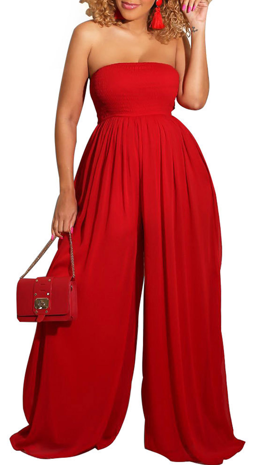 This jumpsuit features a strapless design, smocked bodice, wide-leg silhouette, and a figure-flattering fit for a glamorous and stylish ensemble. Multi-colors available.