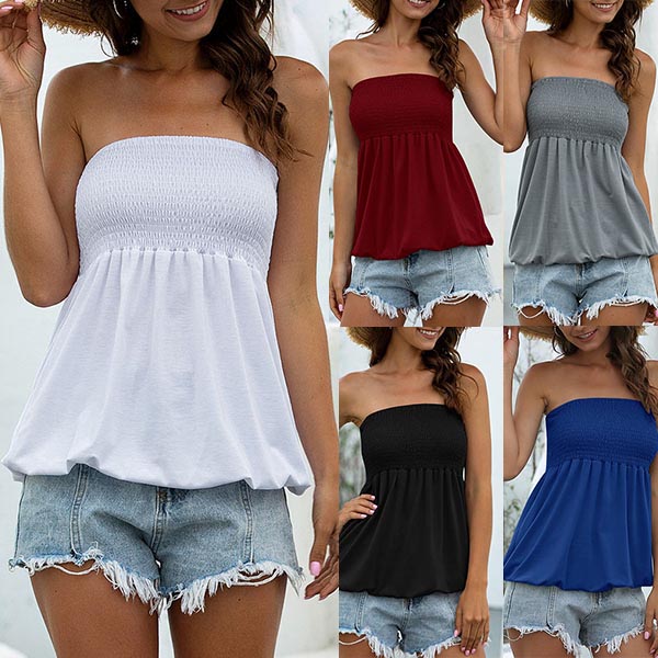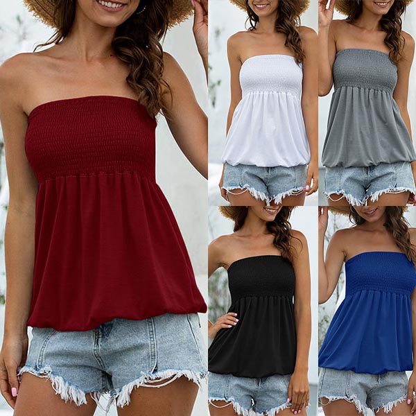 It is a good chance to expose your charming shoulder and seductive collarbone through this wonderful top. Solid color style,the strapless design can lend you a sexy and flirty look. You can add a choker necklace to enhance your entire charm.