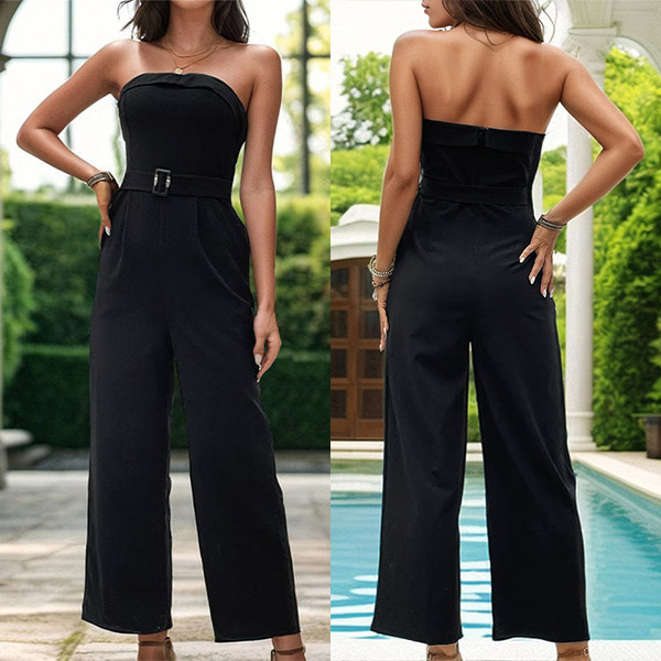 This jumpsuit combines a daring strapless design with a sleek straight-cut silhouette, creating a captivating ensemble that exudes confidence and allure.
