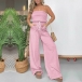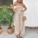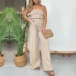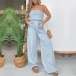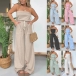 Sexy Stripe Printed Strapless Elastic Waist Patch Pockets Wide-leg Jumpsuit