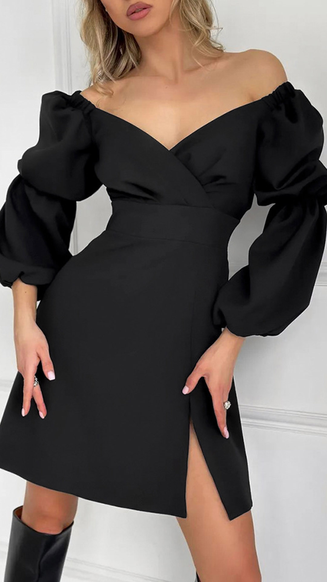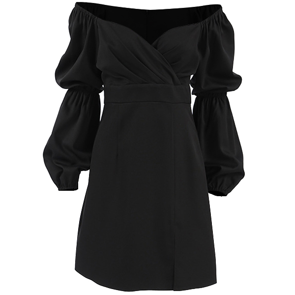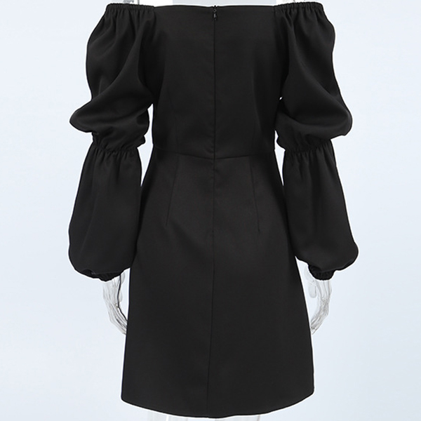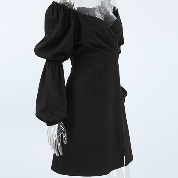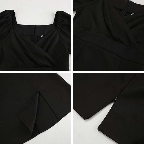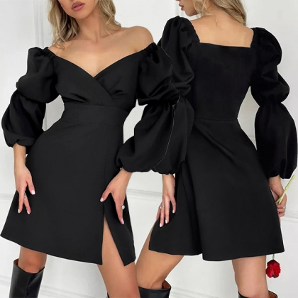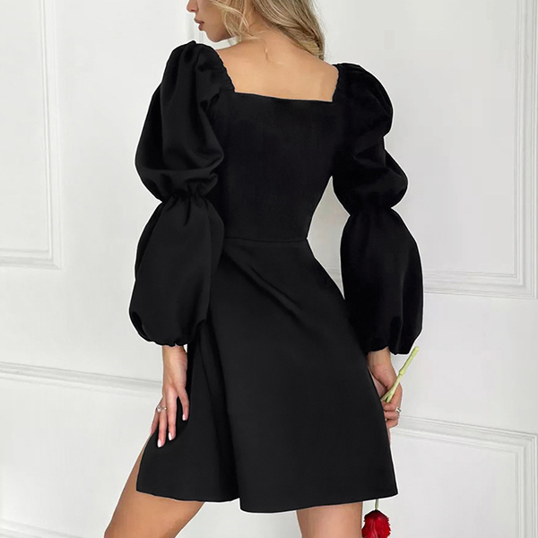 This mini dress combines a sweetheart neckline, puff long sleeves, high-rise waist, side slit detail, and classic black color for a chic and elegant look. Perfect for daily wear!