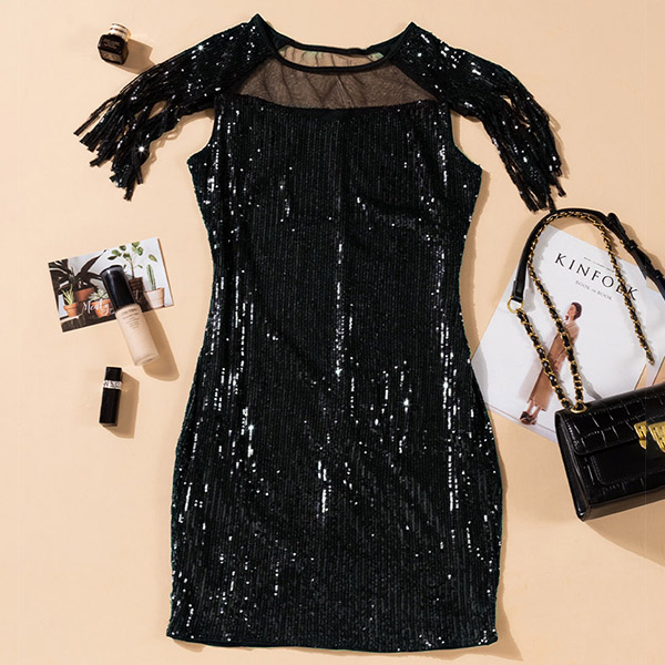 Sexy Tassel Short Sleeve Round Neck Slim Fit Sequin Party Dress