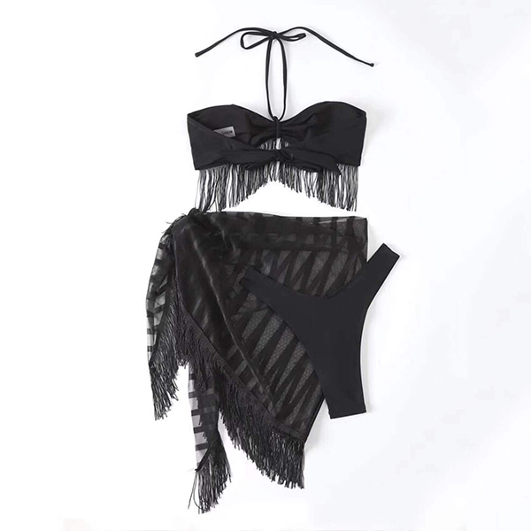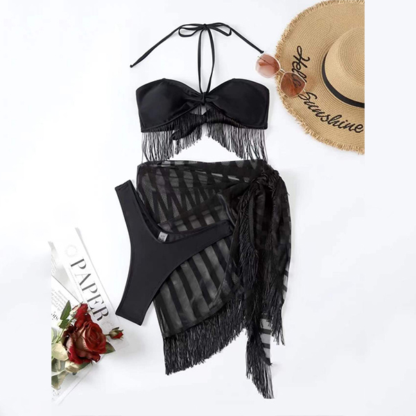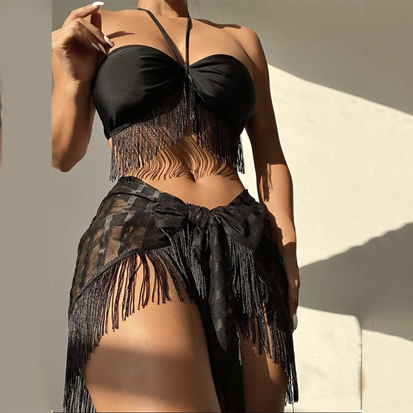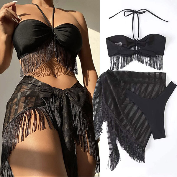This summer, maybe you could try this three-piece bikini set! The halter top is adorned with tassels that will sway in the breeze, low waist bikini bottoms, sexy! While the cover-up skirt with tassels provides a bit of modesty when you need it. Whether you're lounging by the pool or enjoying a day at the beach, this bikini set is sure to turn heads!