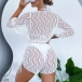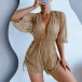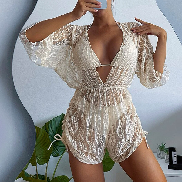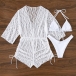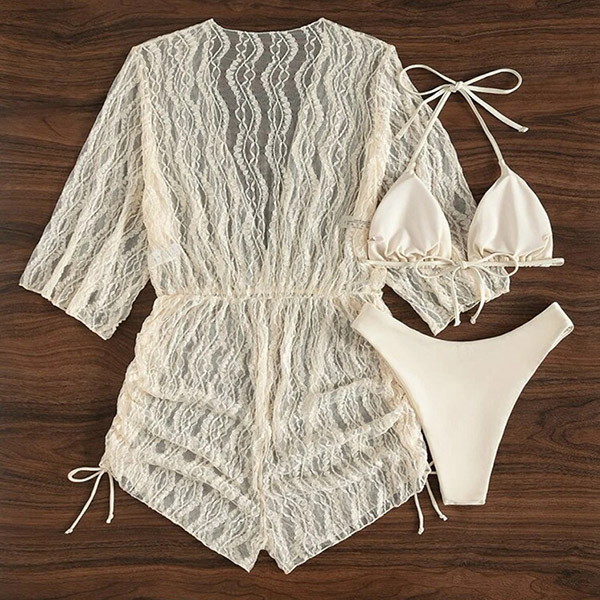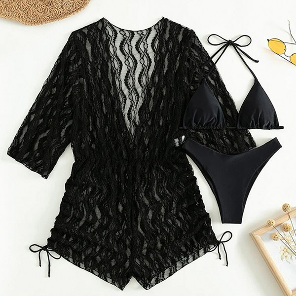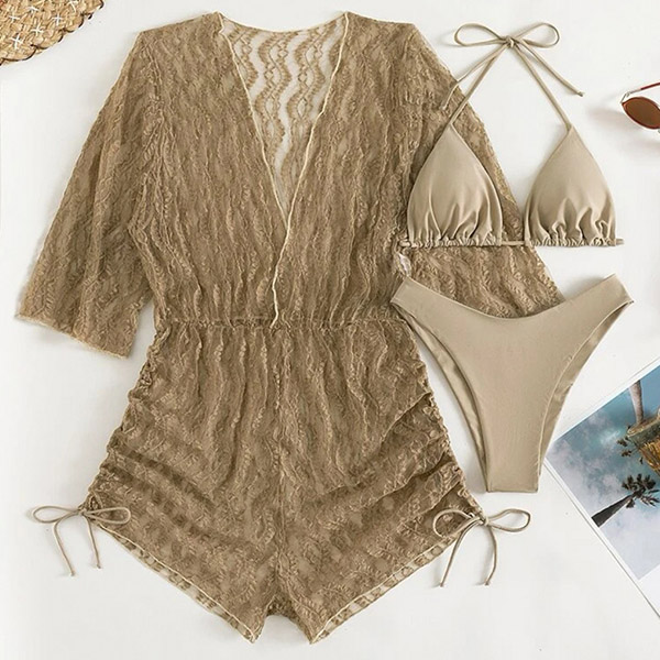 Sexy Three-piece Bikini Set Consist of Halter Swimming Top, Swimming Bottom and Mesh Swimming Cover-up Romper