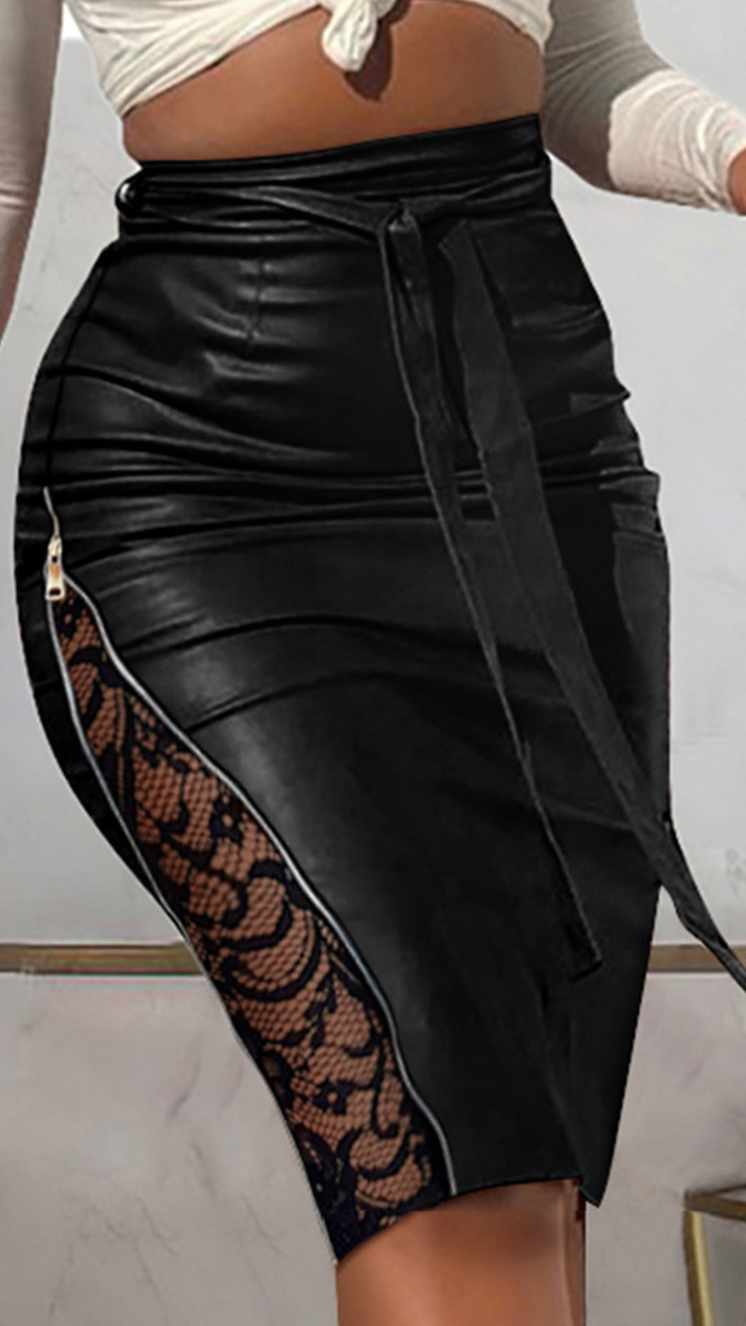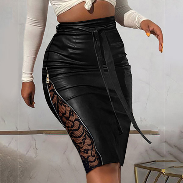 Wanna enhance your feminine appeal? Then you can slip into this PU leather skirt. The high waist and tie-belt design at the waist can better showcase your slender waistline and charming legs. Moreover,the lace spliced details on both sides will lend you some flirty and sassy vibes. Perfect fit for matching with different style tops.