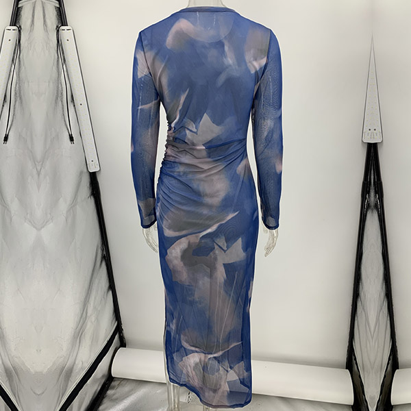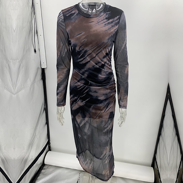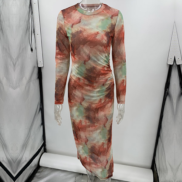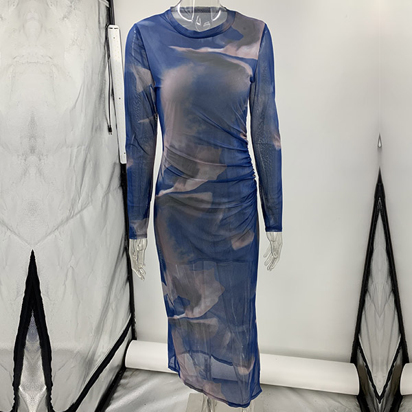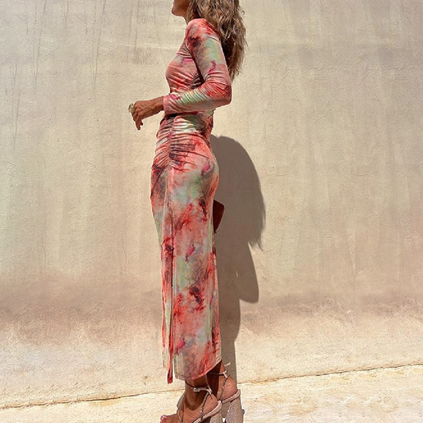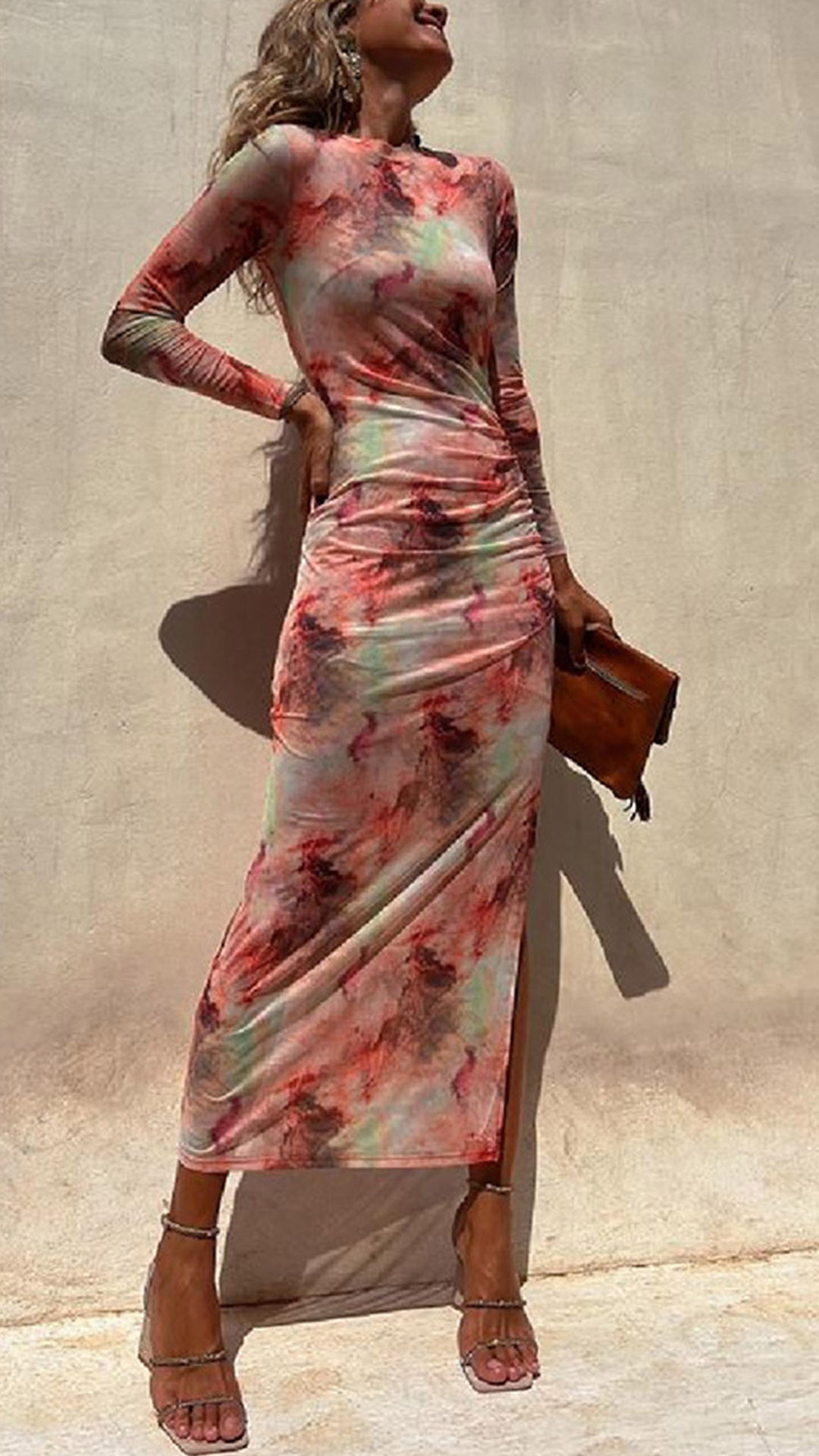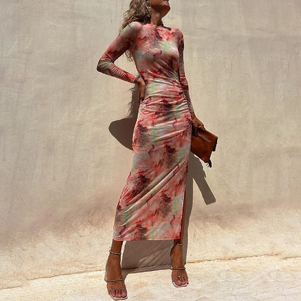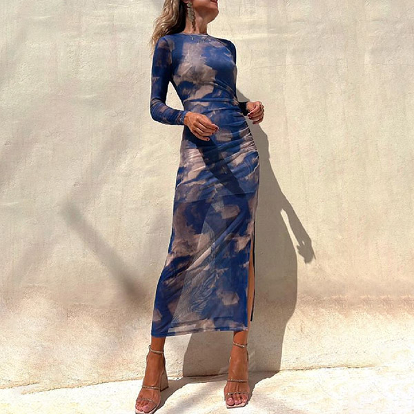 Sexy Tie-dye Round Neck Long Sleeve Slit Semi-through Maxi Dress