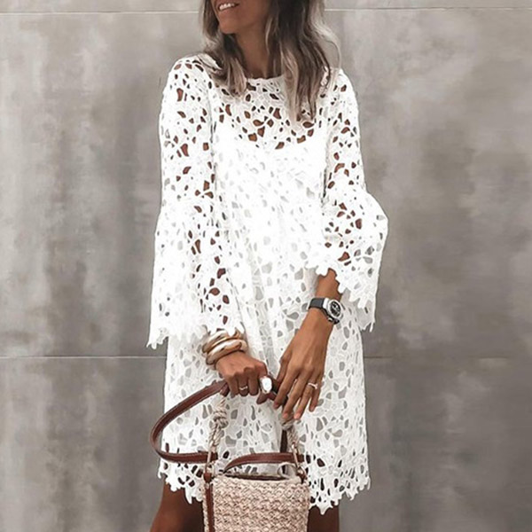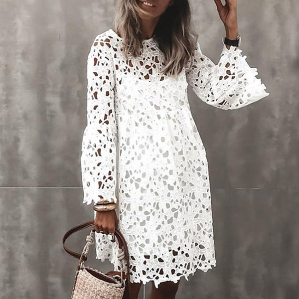 Exude your sexy and charming side through this lace dress. It is finished with trumpet sleeve and round neck design,this dress cam express your sweet and feminine sense. Moreover,the hollow out lace details will make this piece look more attractive. Attracted? Then don't miss this chance.