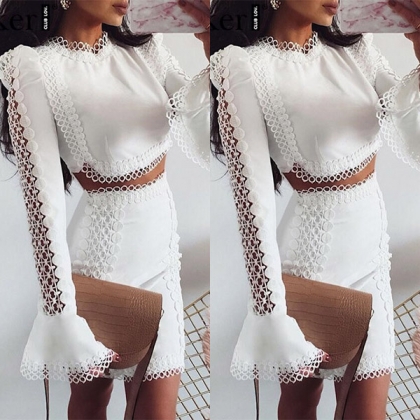 Sexy Trumpet Sleeve Round Neck Lace Spliced Crop Top + High Waist Skirt Two-piece Set