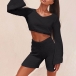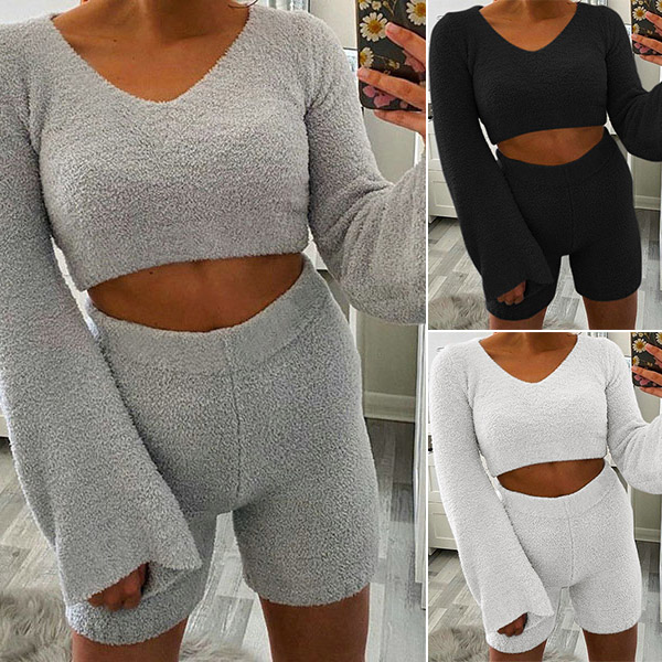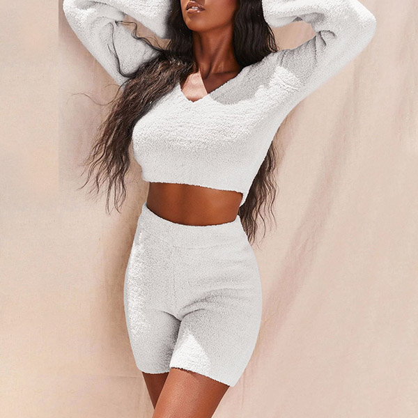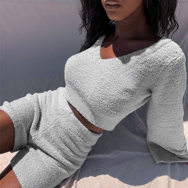 When you wanna update your daily style,you can just slip into this plush two-piece set. Solid color style,including a trumpet sleeve v-neck crop top and a high waist shorts,this two-piece set can give you a comfortable wearing feeling while it maintains your style and personality.