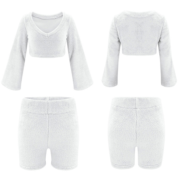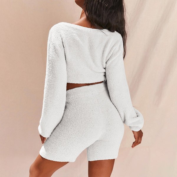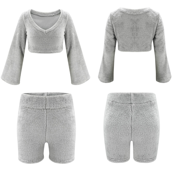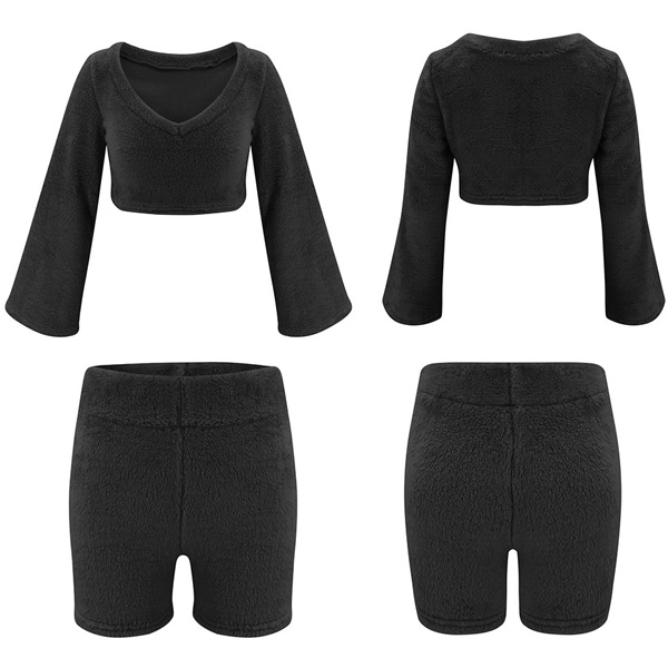 Sexy Trumpet Sleeve V-neck Plush Crop Top + Shorts Two-piece Set
