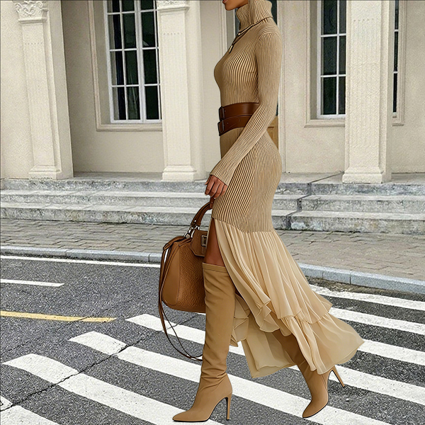 Look at this dress~ The sleek turtleneck brings refined elegance and modern sophistication, creating a polished frame that covers while remaining undeniably chic. Long sleeves provide full coverage, while ribbed fabric contours gently to your body, creating a flattering, body-skimming silhouette with subtle texture. Strategic gauze splicing at the hemline introduces unexpected transparency and ethereal appeal, revealing glimpses of skin that create captivating contrast against the covered top. Wanna have a try?