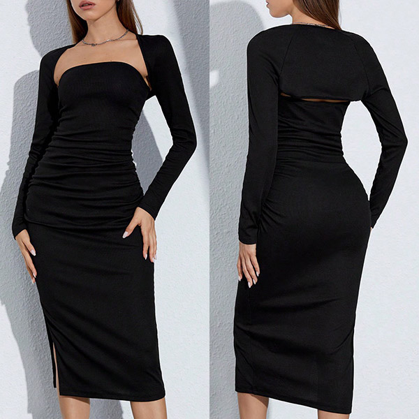 This stylish and versatile set is perfect for a night out or special occasion. The crop cardigan adds a touch of chicness and can be worn over the strapless bodycon dress for a coordinated look. The strapless bodycon dress hugs your curves in all the right places, creating a flattering and sexy silhouette. Pair this set with heels and statement jewelry for a glamorous ensemble that will make you stand out from the crowd.