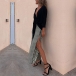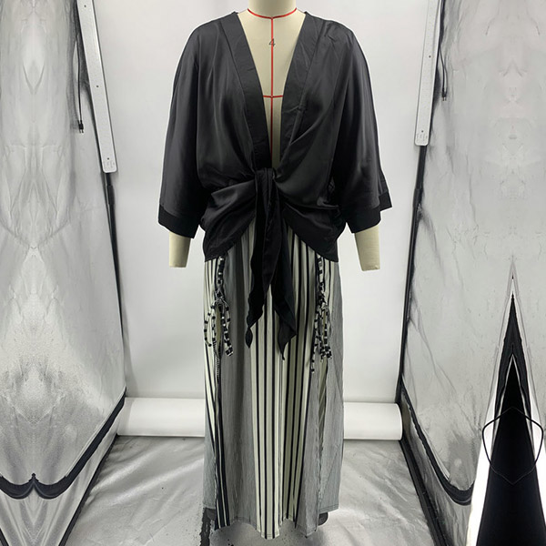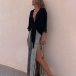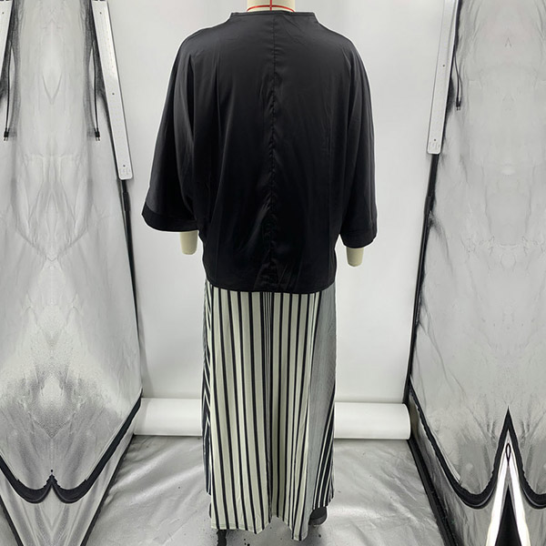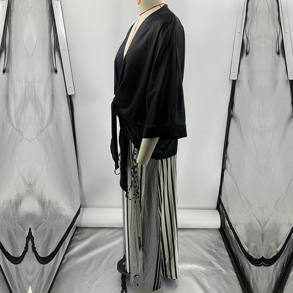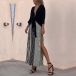 How about this two-piece set? The self-tie V-neck shirt is both elegant and sexy, with a flattering neckline that accentuates your curves. The vertical stripe printed slit skirt is both stylish and comfortable, with a high slit that adds a touch of sexiness to the outfit.