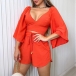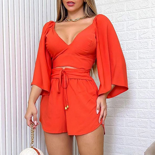 This sexy two-piece set is the perfect addition to your wardrobe. The trumpet sleeve crop top features a V-neckline, elbow long trumpet sleeves, and a cropped length. The drawstring shorts feature a high-waisted fit and relaxed fit with an adjustable drawstring waist. The fabric is lightweight and breathable, making it perfect for hot summer days.