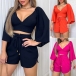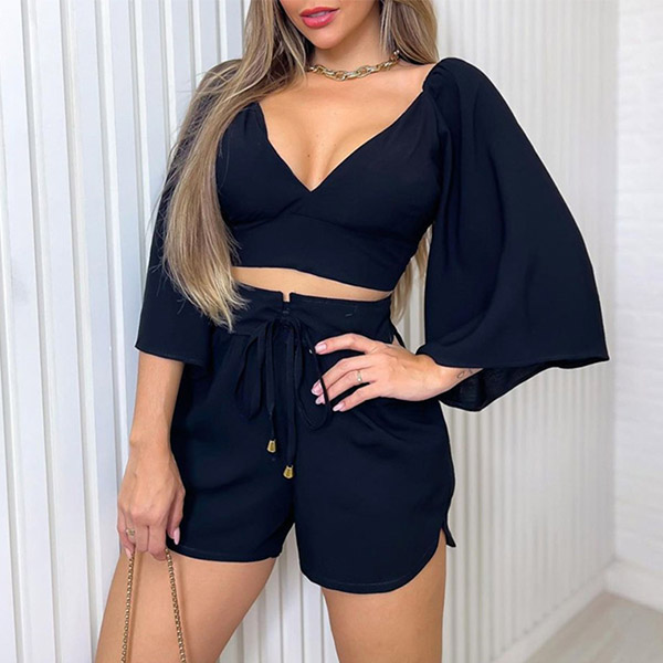 Sexy Two-piece Set Consist of Trumpet Sleeve Crop Top and Drawstring Shorts