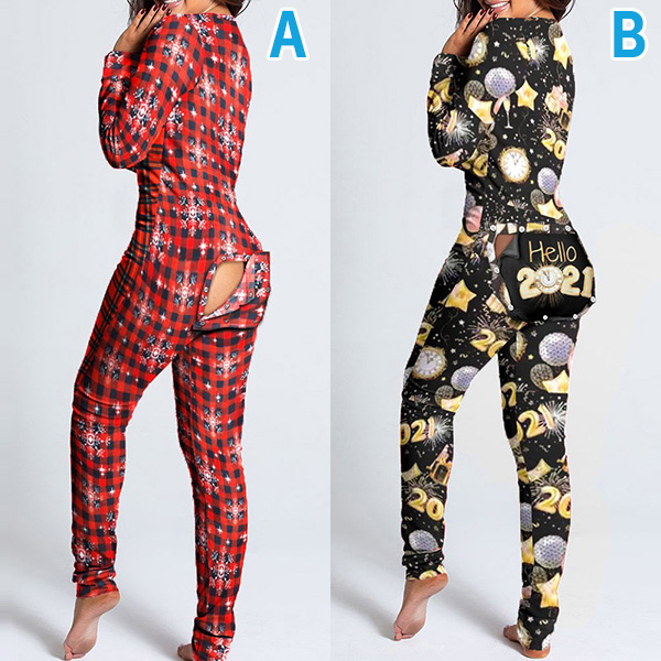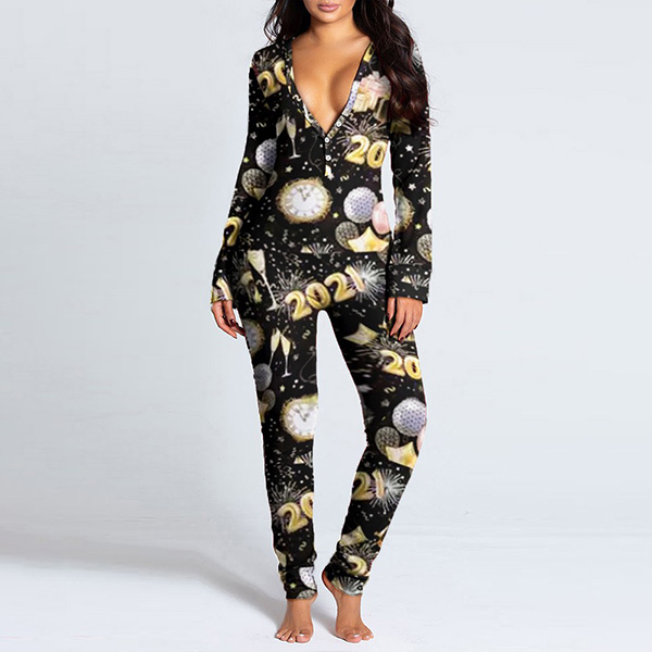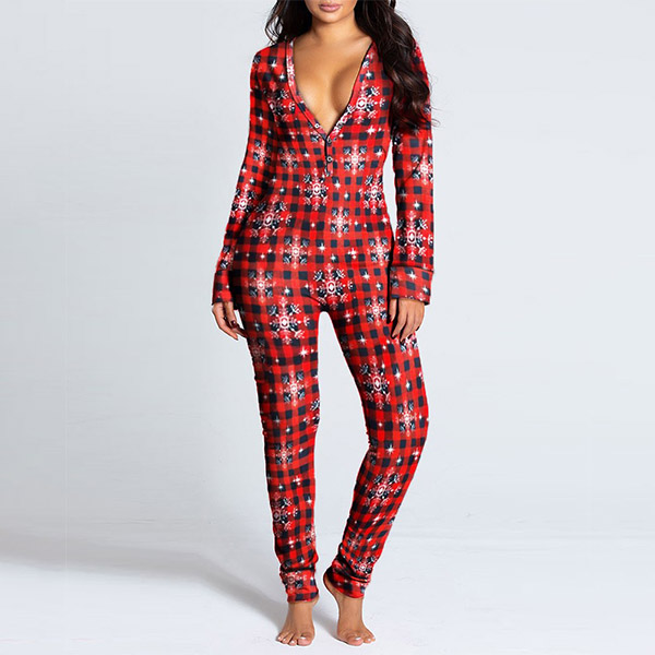 Sexy V-neck Butt Flap Slim Fit Printed Home-wear Jumpsuit One-piece Pajama