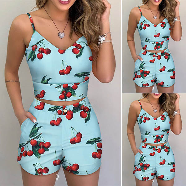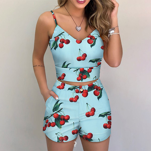 Sexy V-neck Cherry Printed SLing Crop Top + Shorts Two-piece Set