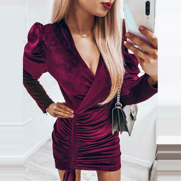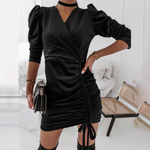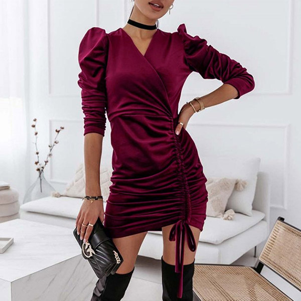 Sexy V-neck Drawstring Hem Long Sleeve Solid Color Slim Fit Dress