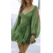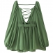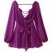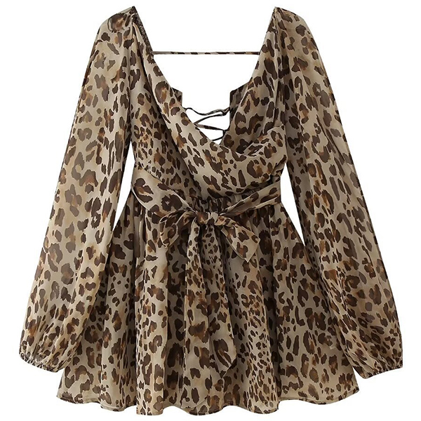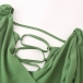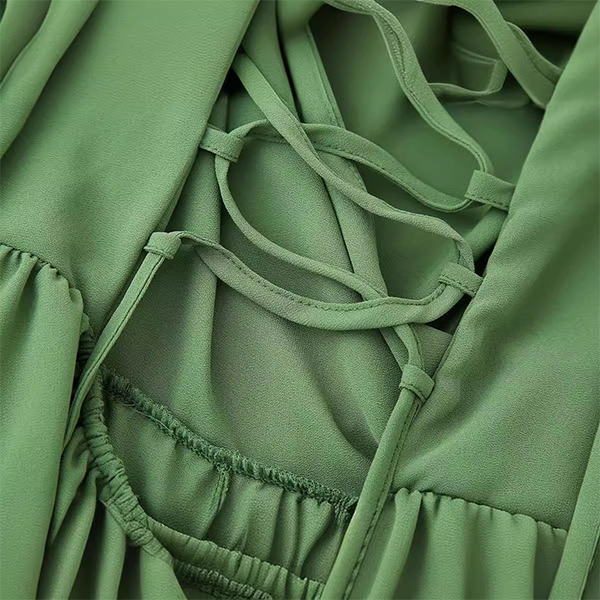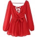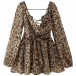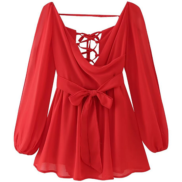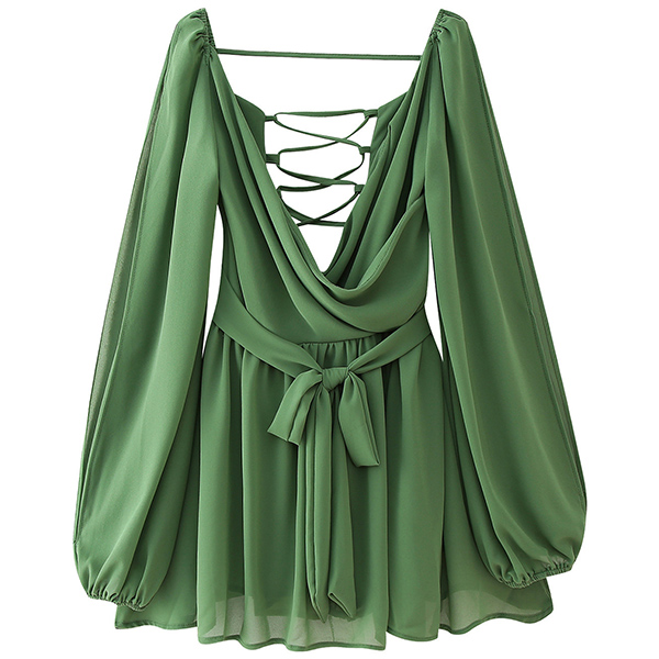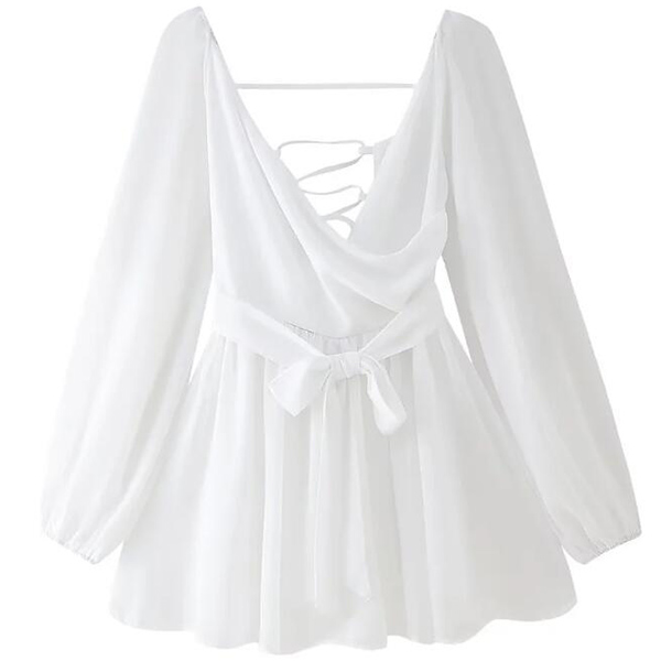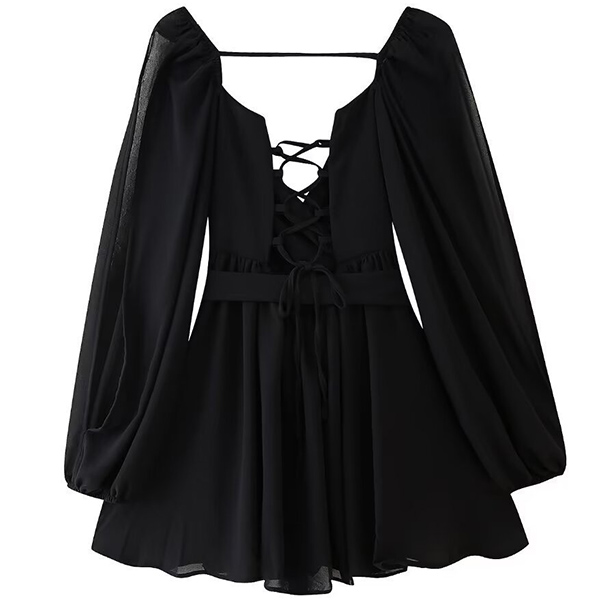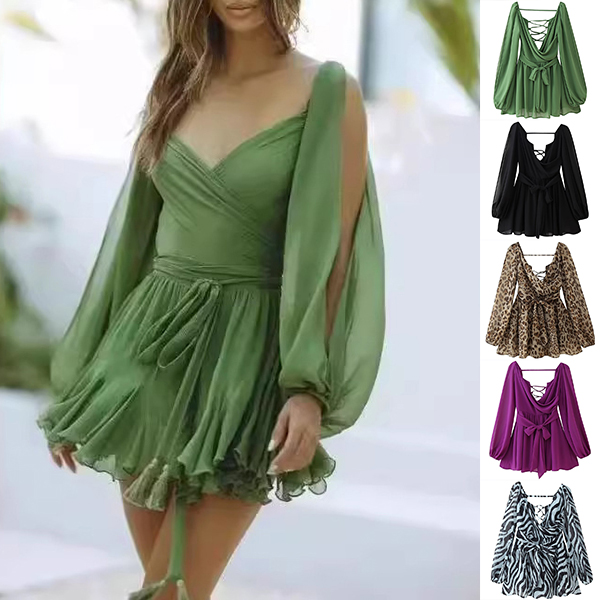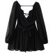Sexy V-neck Gauze Spliced Slit Long Sleeve Self-tie Ruffle Lace-up Backless Mini Dress