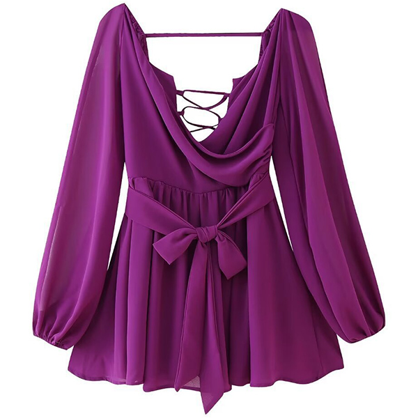 This mini dress features a V-neckline, gauze spliced long sleeve with slit details, a self-tie waist, ruffle accents, lace-up back, and a backless design, creating a sultry and glamorous look. Multi-colors avabile.