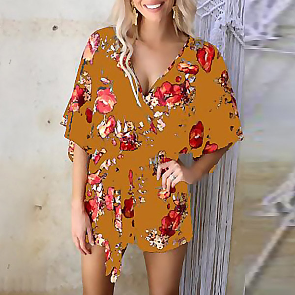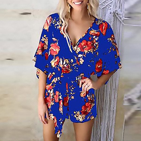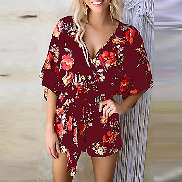 Sexy V-neck Half Sleeve Tie-belt Printed Romper