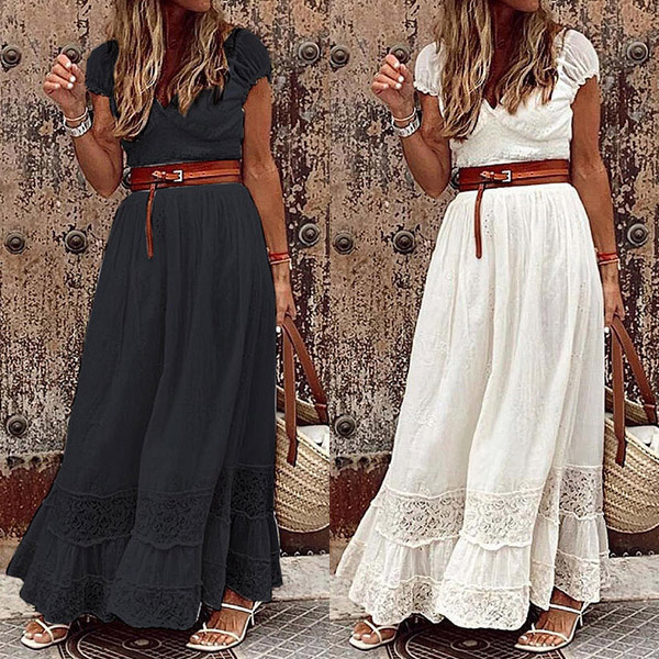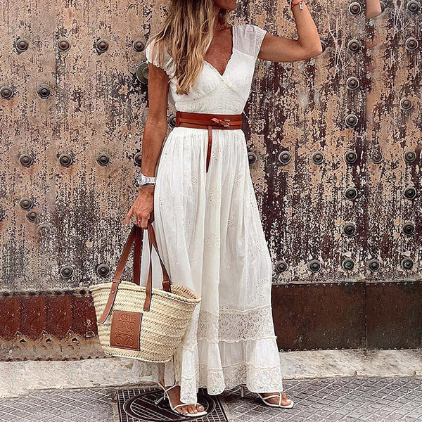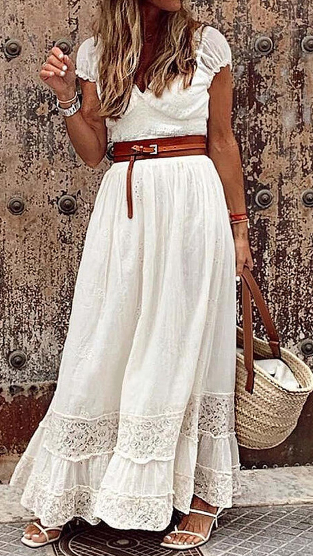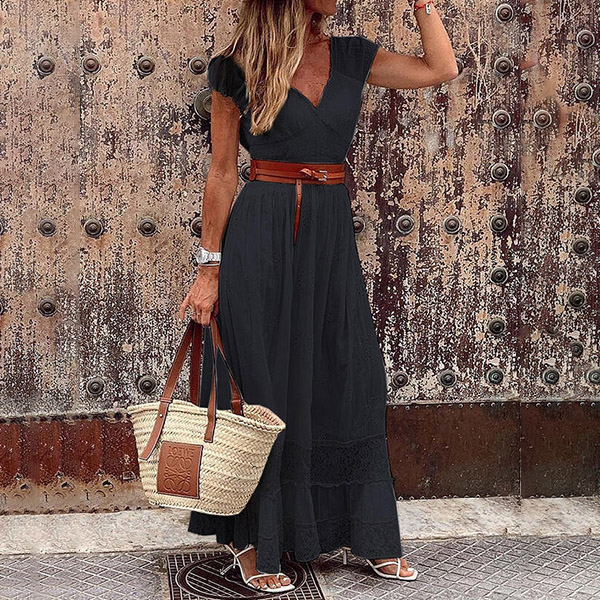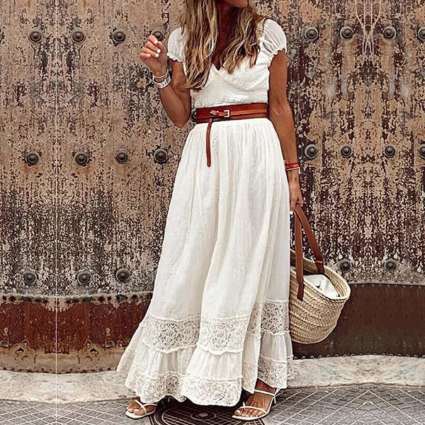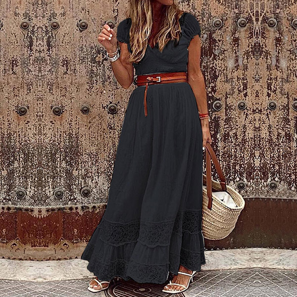 Make your summer wardrobe more complete by adding this beautiful dress. The lace spliced details and v-neck design can help exude your charming femininity,and the high waistline and maxi length design can better showcase your slender figure. You can add a thin waistband if you wanna look more beautiful and charming!