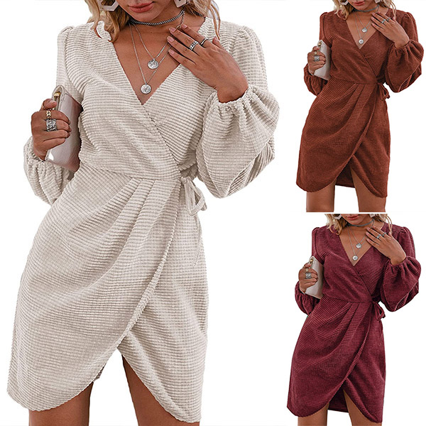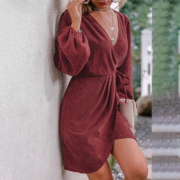 Sexy V-neck Irregular Hem Long Sleeve Solid Color Dress