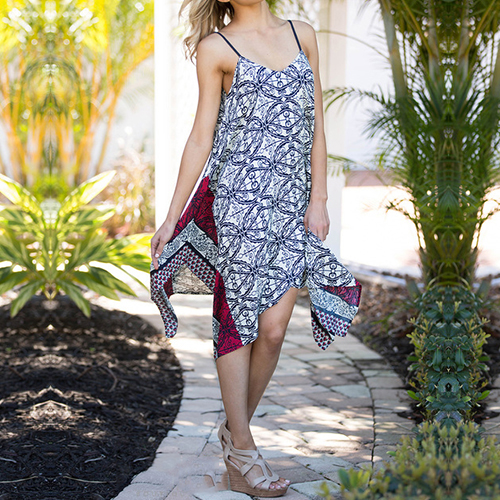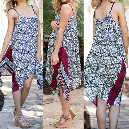 Sling style,boasting a vibrant floral print,v-neckline and an irregular hem,chic and stylish.
