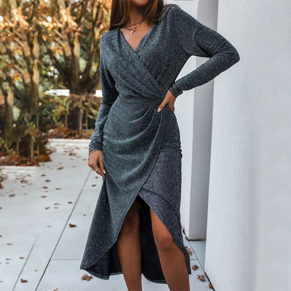Sexy V-neck Irregular Slit Hem Long Sleeve High Waist Solid Color Dress