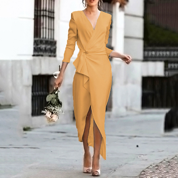 For the coming parties and gatherings,you can just just throw yourself into this dress. The deep v-neck,irregular hem with slit design make this piece look so sexy and alluring. On the other hand,its high waistline and fit silhouette design can better showcase your slender figure.