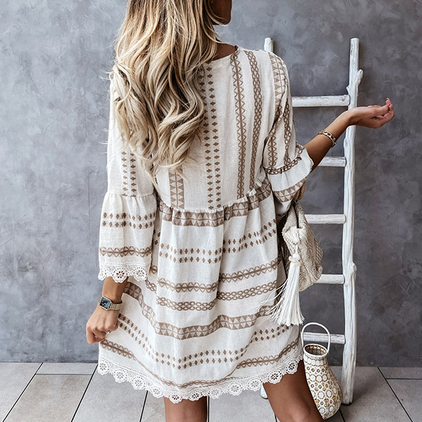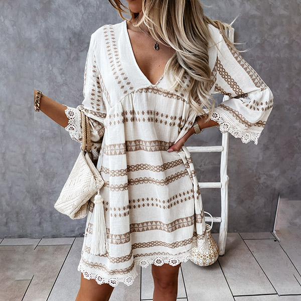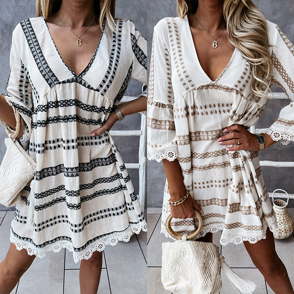 Crafted from soft and breathable fabric,with a loose silhouette,this dress can give you an utmost comfort. The v-neck,lace details at the cuff and hem part will enhance your feminine appeal,while the chic printed pattern design will make it look more attractive. It is perfect fit for your daytime out and night dating.