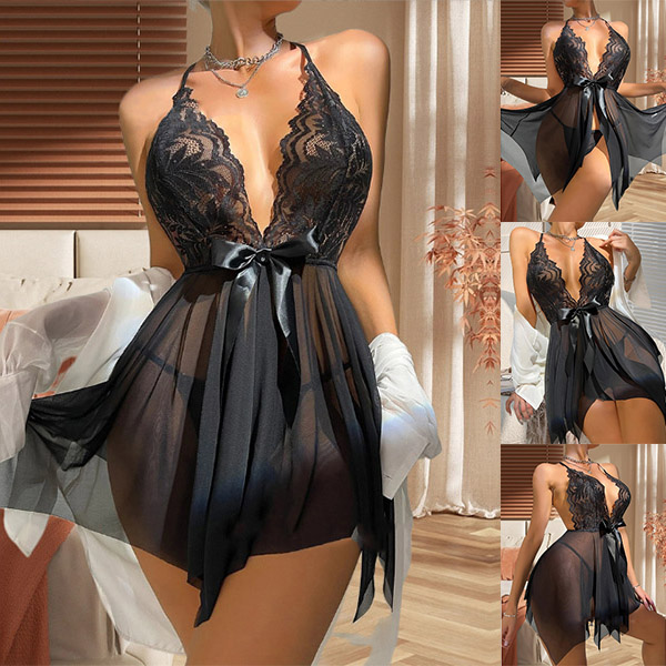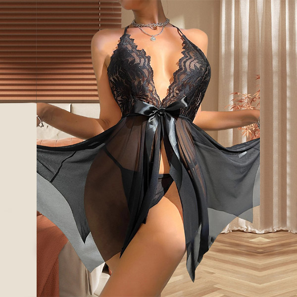 Sexy V-neck Lace Spliced Chiffon Backless Pajamas Dress/Nightwear Dress